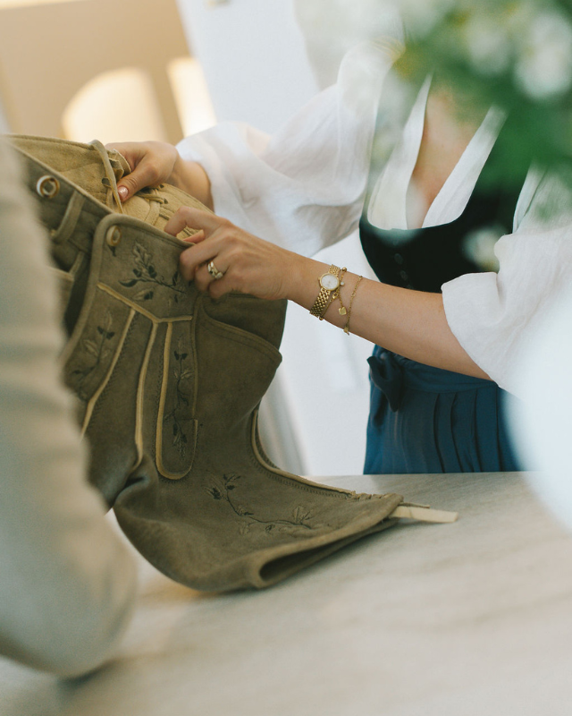Die Beratung dauert in der Regel 2–3 Stunden und ist für euch kostenfrei. Ihr könnt so viele Begleitpersonen mitbringen, wie ihr möchtet – wir empfehlen jedoch, euch auf eure engsten Lieblingsmenschen zu beschränken, damit es persönlich und entspannt bleibt.Änderungen können jederzeit unkompliziert umgesetzt werden – von kleinen Passformanpassungen bis hin zu individuellen Änderungen für einen wachsenden Babybauch.Auf Wunsch lassen sich maßgefertigte Lederhosen mit Initialen oder anderen individuellen Details personalisieren.