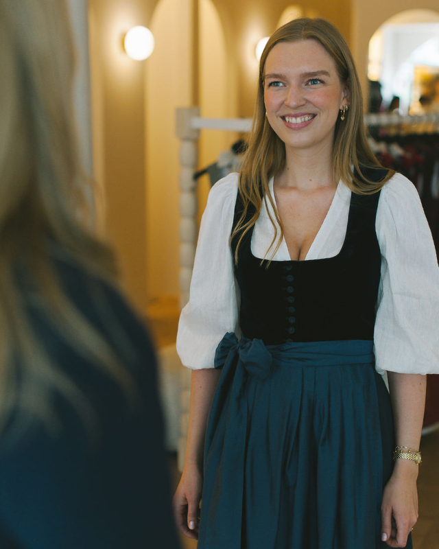 Deshalb gibt es 1:1 passende Westen-Pendants, bei denen sich Stoffe und Materialien der Dirndl exakt widerspiegeln, sowie Modelle, die sich in Farben und Strukturen anlehnen. So passt ihr wunderbar zusammen, bleibt aber jeder für sich individuell und einzigartig.