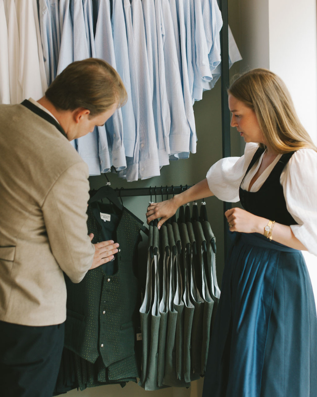 Bei uns erwartet euch eine private Atmosphäre, in der wir uns viel Zeit für euch und eure Wünsche nehmen. Gemeinsam stoßen wir auf euren besonderen Tag an und unser Team berät euch persönlich zu passenden Modellen und Kombinationsmöglichkeiten für Braut und Bräutigam. So könnt ihr ganz in Ruhe euren perfekten Hochzeitslook in Tracht entdecken.
