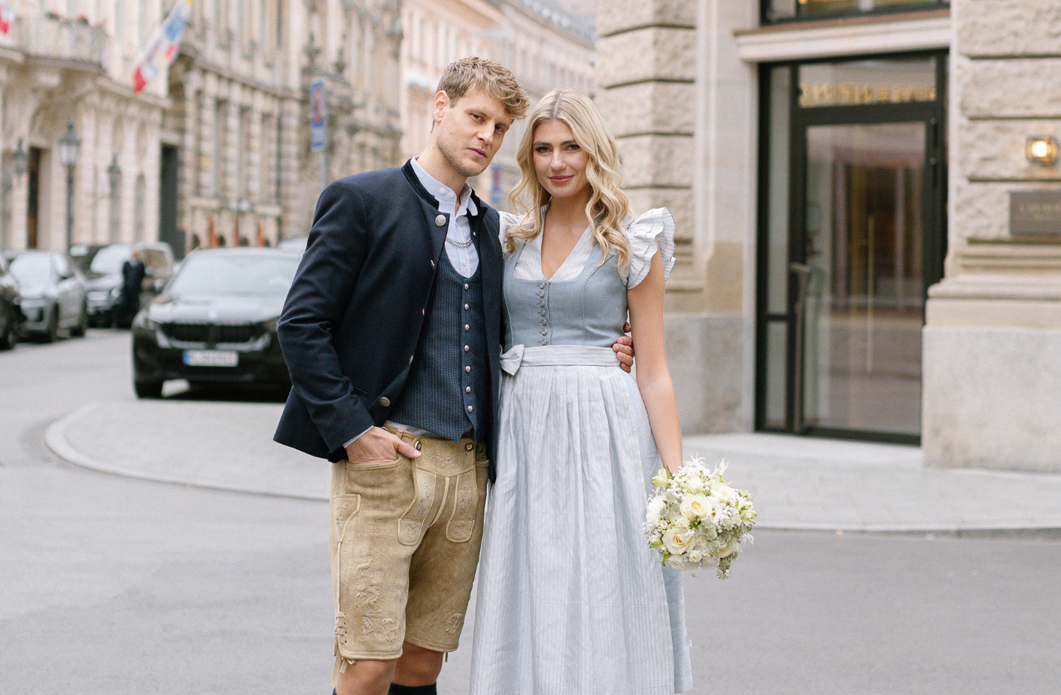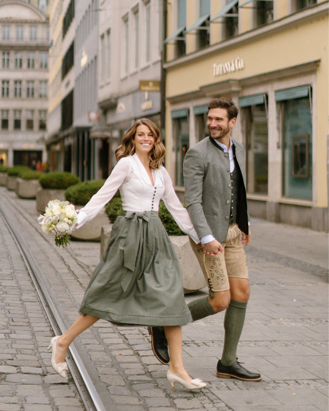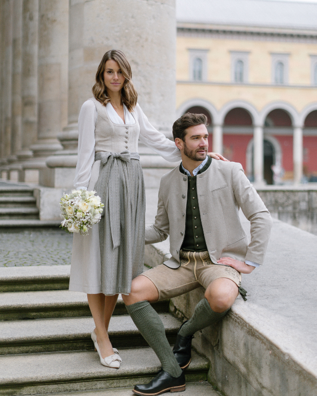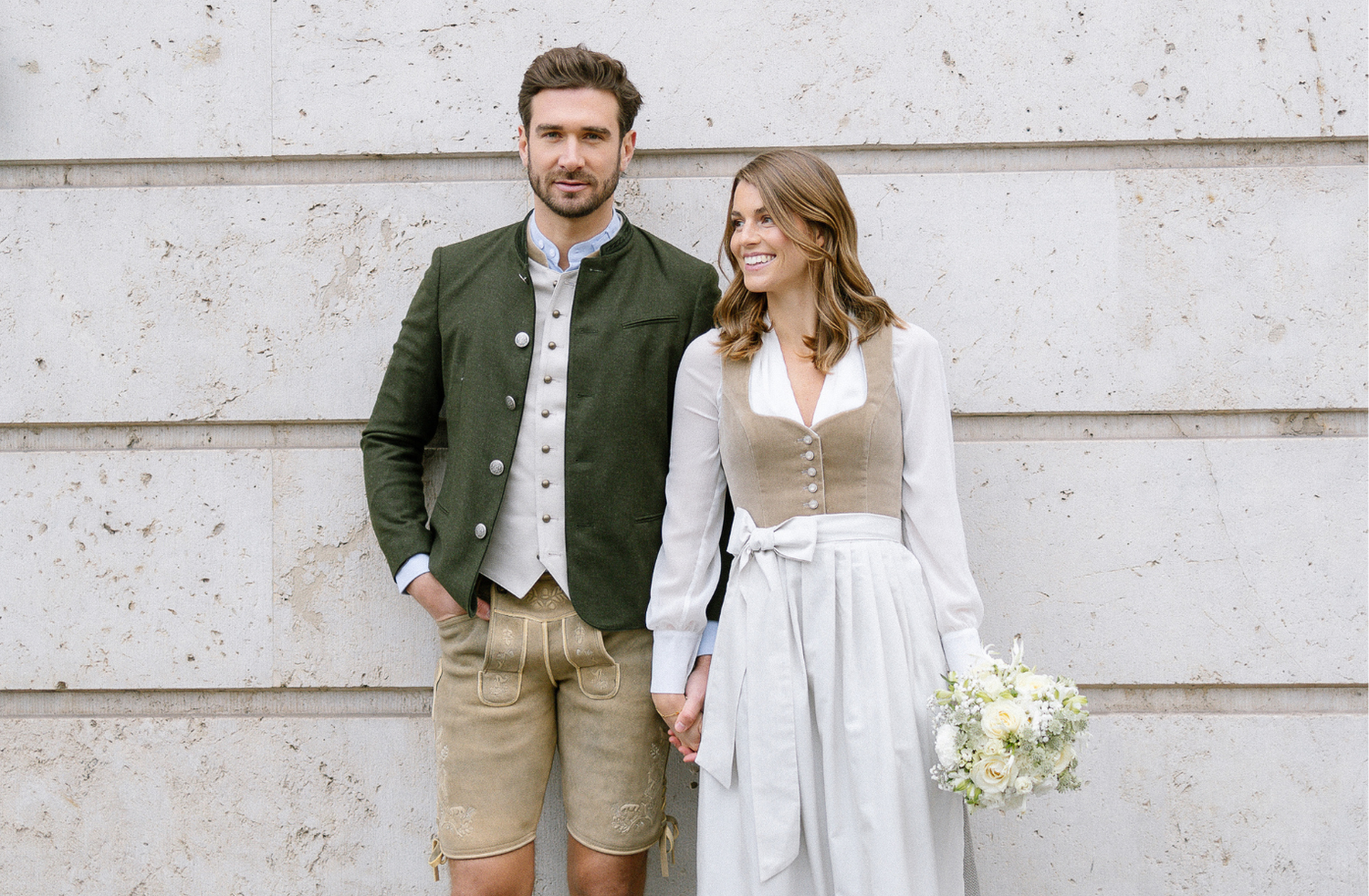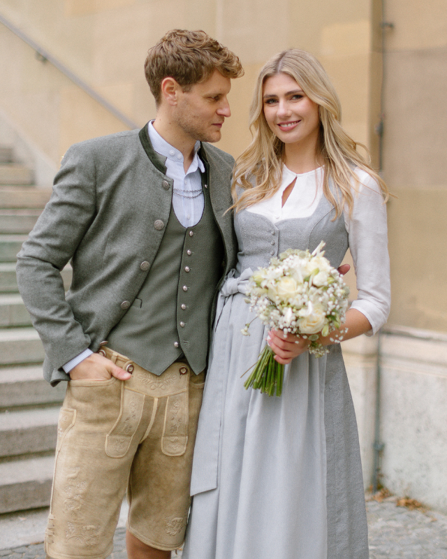 Für kühlere Tage lassen sich beide Outfits ideal ergänzen: mit den passenden Jankern – Josef für den Bräutigam und Elisabeth für die Braut – die den Look funktional und optisch komplettieren.