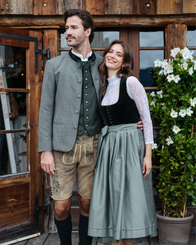 Dazu eignet sich Weste Adrian in Oliv perfekt als abgestimmter Herrenlook. Die Farbwelt greift die Nuancen des Dirndls auf und sorgt für ein harmonisches Gesamtbild.