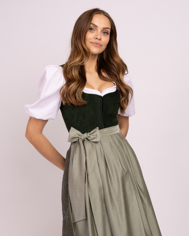 Dirndl Ella ist mit seinem olivfarbenen Samtmieder, dem tonalen Rock und der beigen Schürze ein Modell, das farblich hervorragend in die Wintermonate passt. Die gedeckten Töne wirken ruhig, warm und elegant.