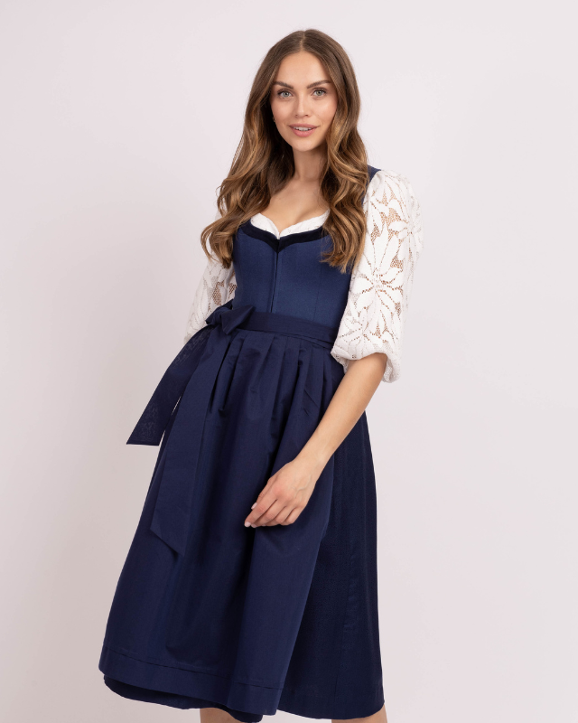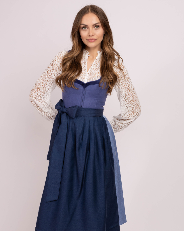 Dirndl Rosalinde setzt auf ein klassisches Zusammenspiel aus Dunkelblau und Beige – ein ruhiger, zeitloser Look. Das Mieder aus Leinen, der passende Rock und die helle Schürze ergeben eine klare, elegante Kombination, die sich besonders gut für festliche Anlässe eignet.